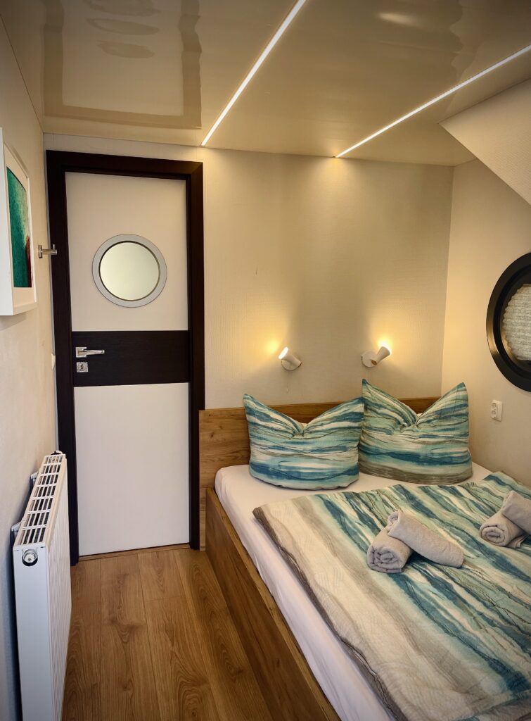 Unser Hausboot bietet Platz für bis zu 4 Personen. Es gibt eine Koje im Heck mit einem Doppelbett.